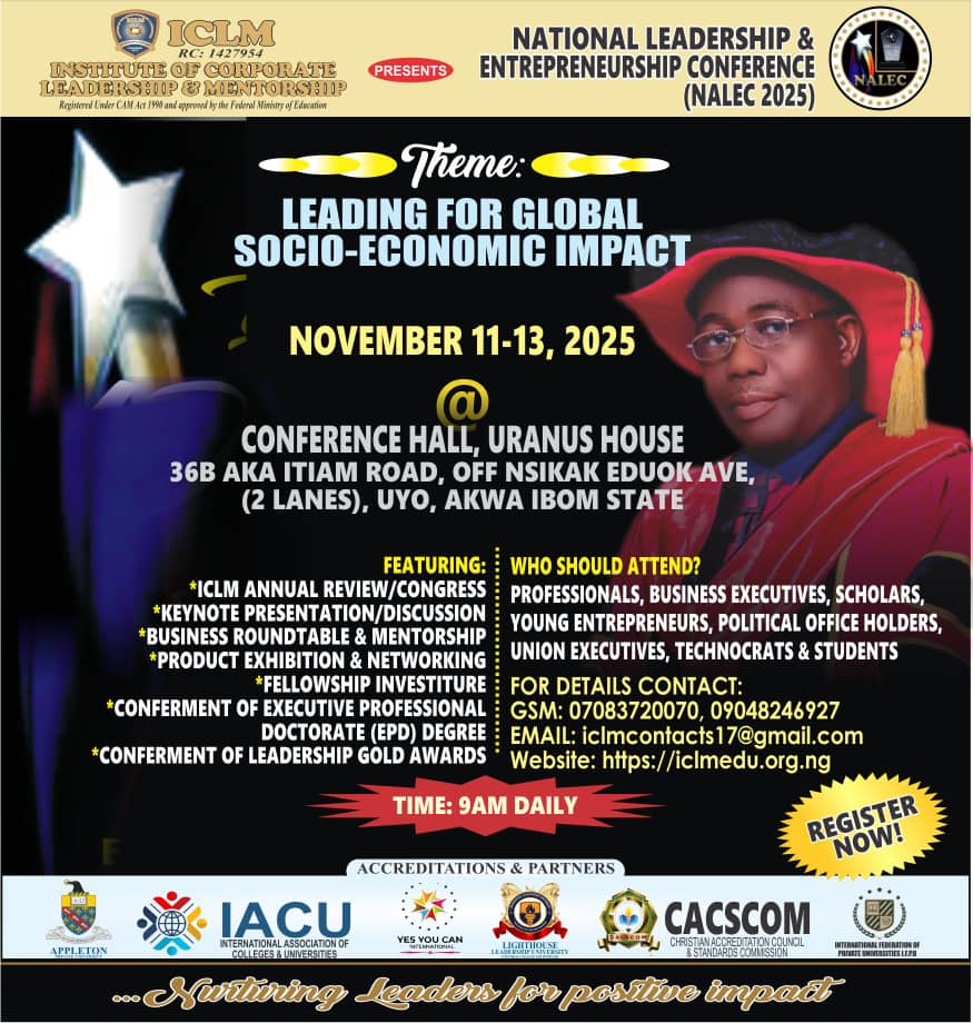 The ICLM National Leadership and Entrepreneurship Conference is an annual open gathering of renowned leaders, entrepreneurs, emerging entrepreneurs, captains of industries, the political class, technocrats, youths, religious and traditional leaders. It is a structured initiative designed to empower individuals, particularly aspiring and existing leaders and entrepreneurs, with the skills, knowledge, and resources needed to start, sustain, and climb their leadership/businesses ladder.