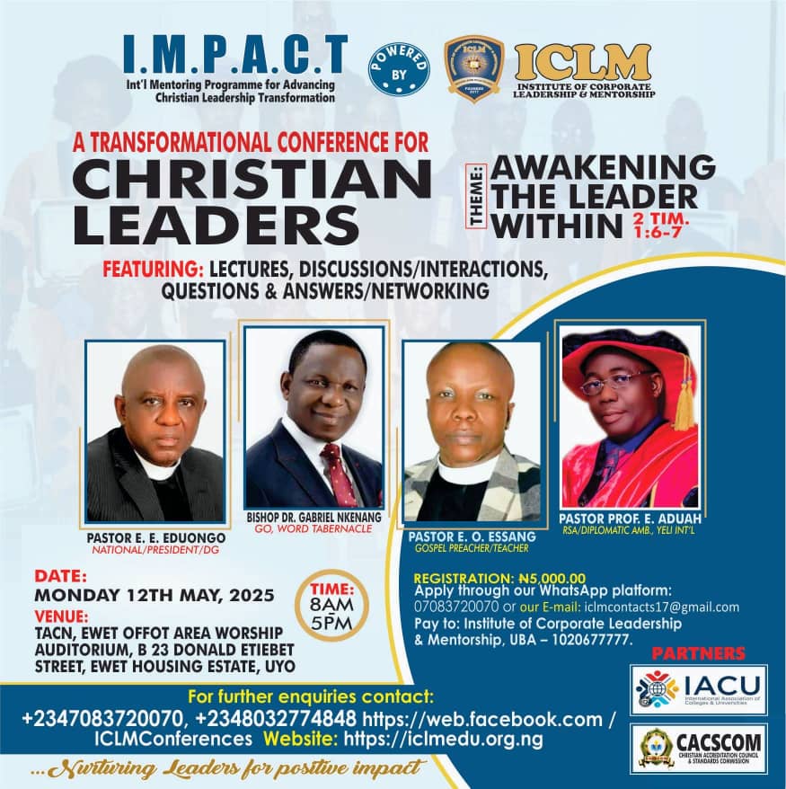 ICLM Christian Ministerial Leadership is a faculty of the Institute designed to equip individuals and Church Ministers/Workers for effective ministry and leadership in various contexts. The faculty which operates in partnership with Lighthouse Leadership University Universal College and Seminary aims to produce well-rounded, effective, and spirit-led ministers who can make positive impact in their communities and the world. The centre focuses on developing skills and knowledge in areas such as: