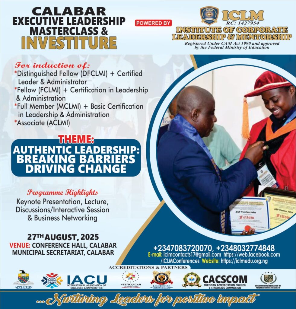 ICLM Executive Leadership Masterclass and investiture is a quarterly grand event held in designated cities to train all aspiring inductees into any of the membership categories of the Institute with the requisite knowledge in leadership. It focuses on career advancement, leadership development, knowledge improvement and expertise development in selected fields, as well as networking with peers and professionals.